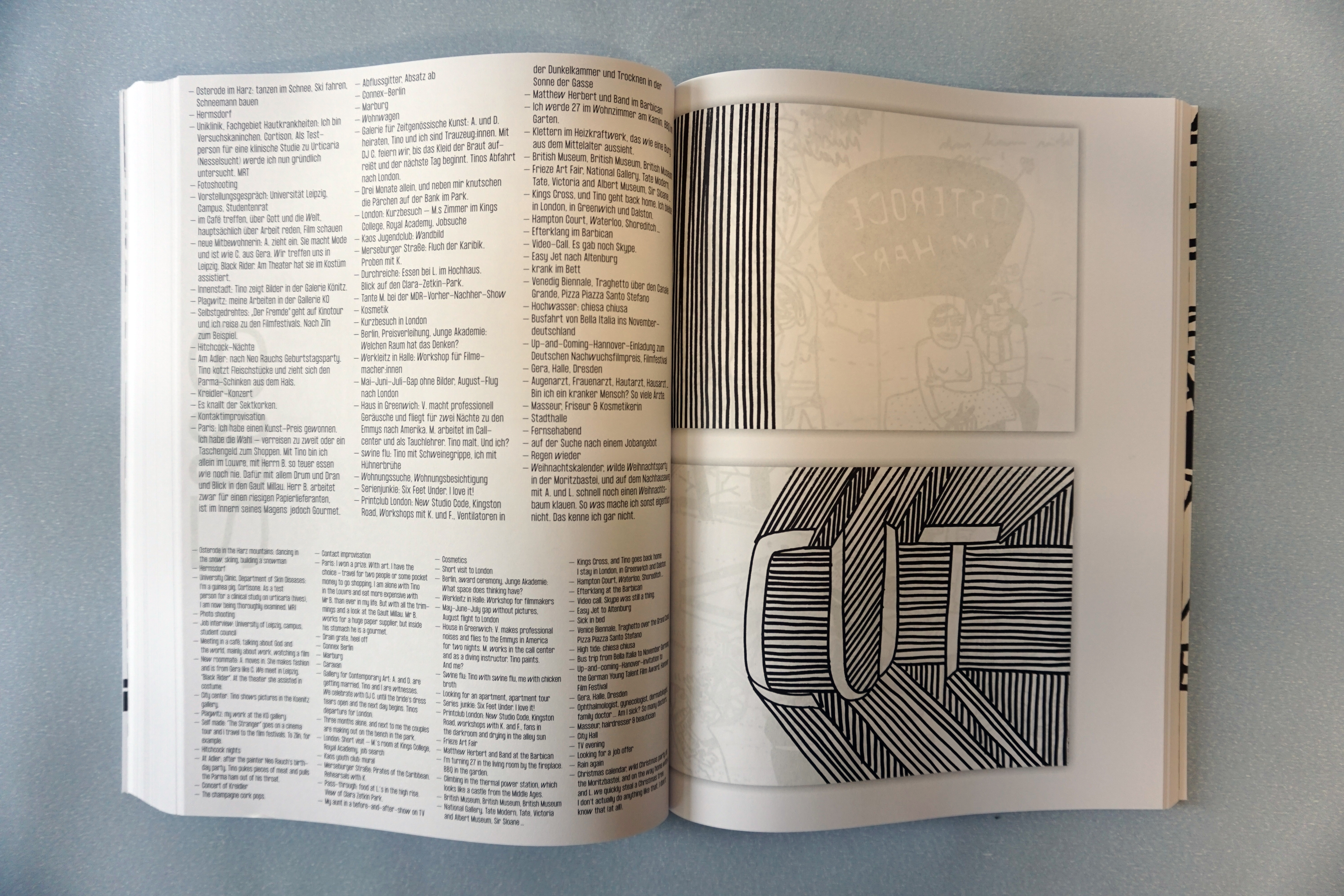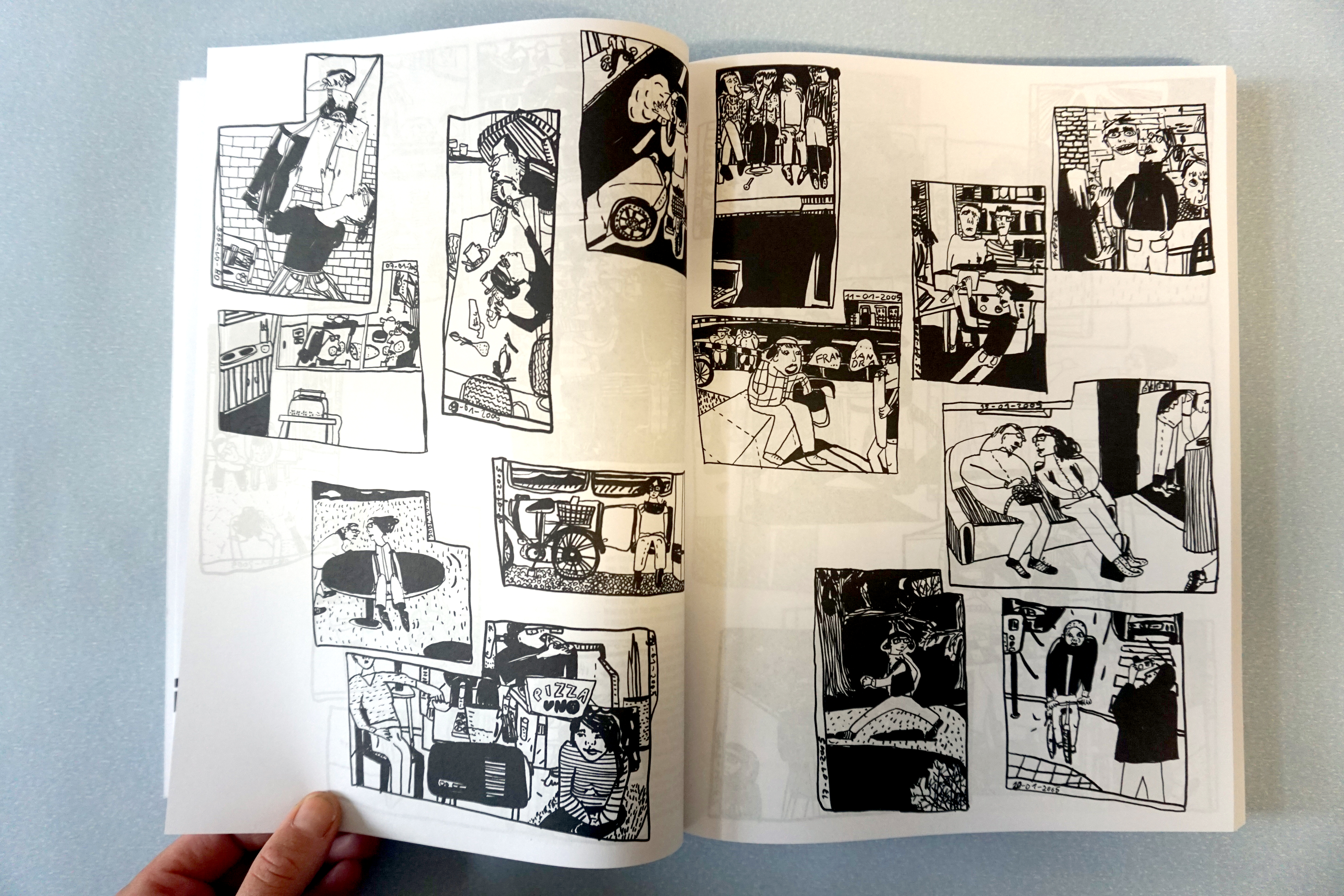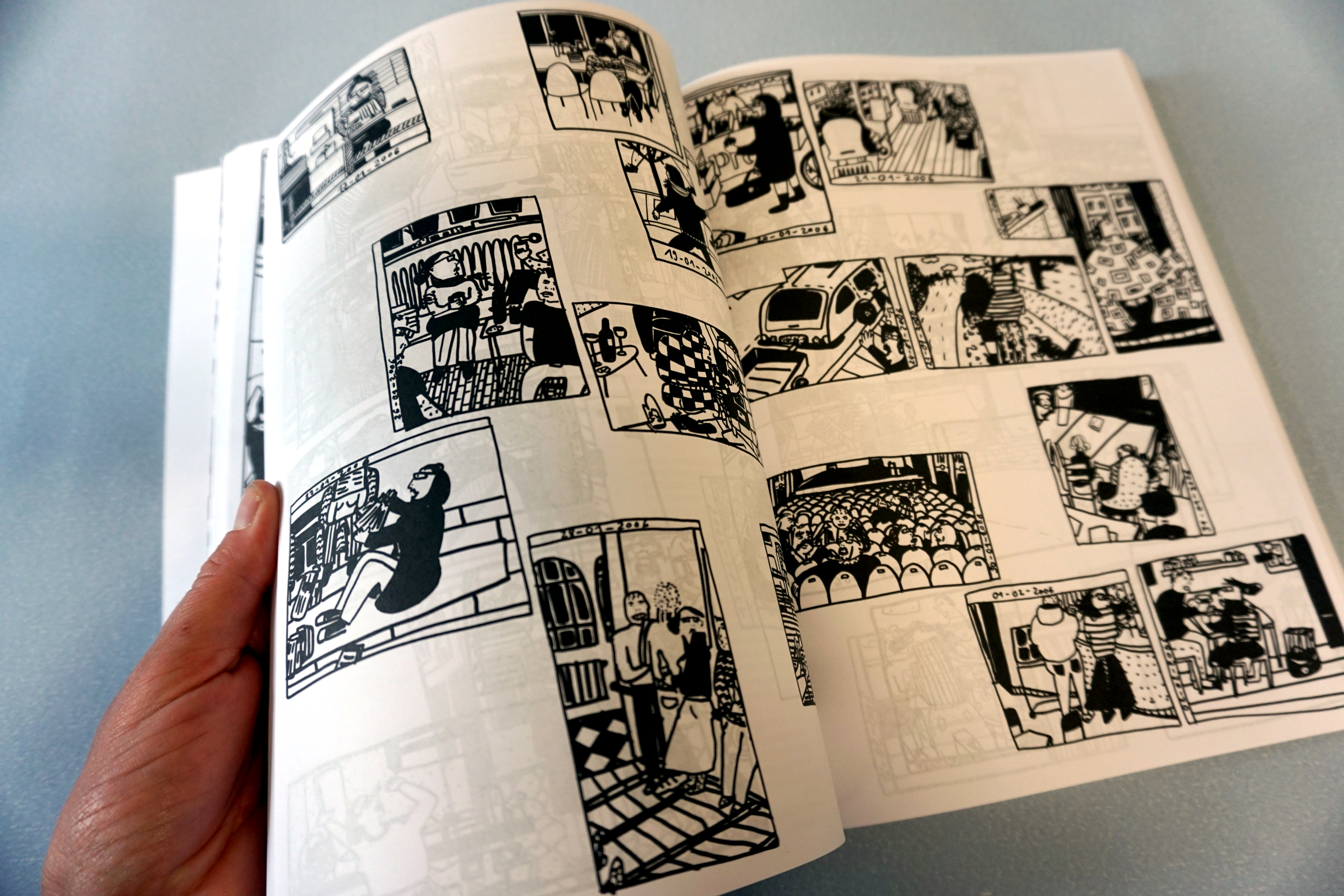 ︎Franziska Junge zeichnet Tagebuch wie Schriftsteller:innen schreiben: 2003 begann sie, auf einer großen Papierrolle jeden Tag ein einziges Bild zu zeichnen, das den Tag kurz zusammenfasst. Die schwarz-weißen Bilderfolgen erzählen keine einfache Story sondern die mehr als 2000 Filzstiftzeichnungen spannen ein kolossales Panorama – riesige Geschichtenbögen: der Alltag einer jungen Frau zwischen Erwachsenwerden und Kinderkriegen, Reisen um die Welt und beruflicher Selbstverwirklichung.︎