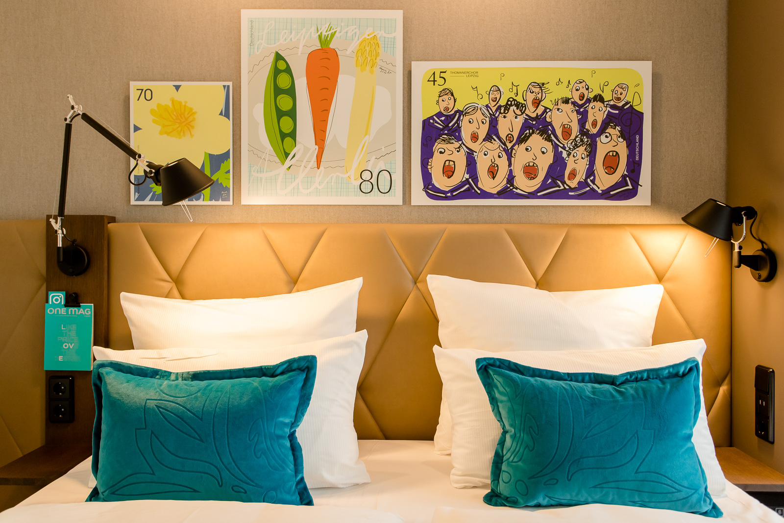 Briefmarken zur Gestaltung der Frühstücksbar und der Hotelzimmer im Motel One THE POST Leipzig